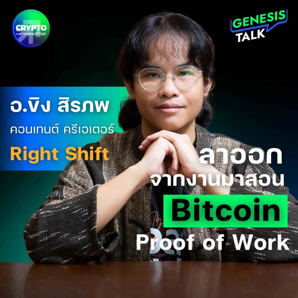 สำหรับ อ.ขิง เองนั้นเส้นทางการให้ความรู้บิตคอยน์ของเขาเป็นการสะสม “Proof of Work” ในความหมายเชิงปฏิบัติ คือสิ่งที่พิสูจน์ได้ว่าเขาทำงานมาอย่างต่อเนื่องและจริงจัง ไม่ใช่แค่คำกล่าวอ้าง