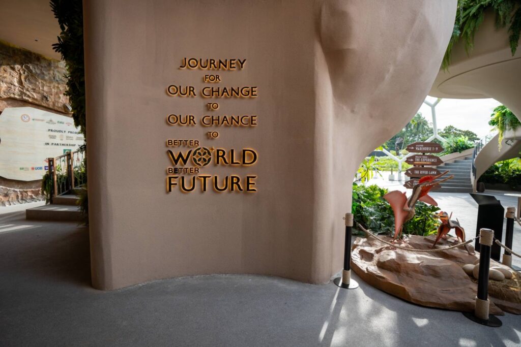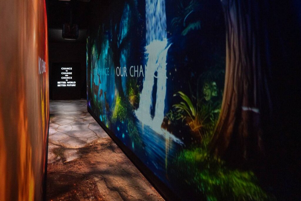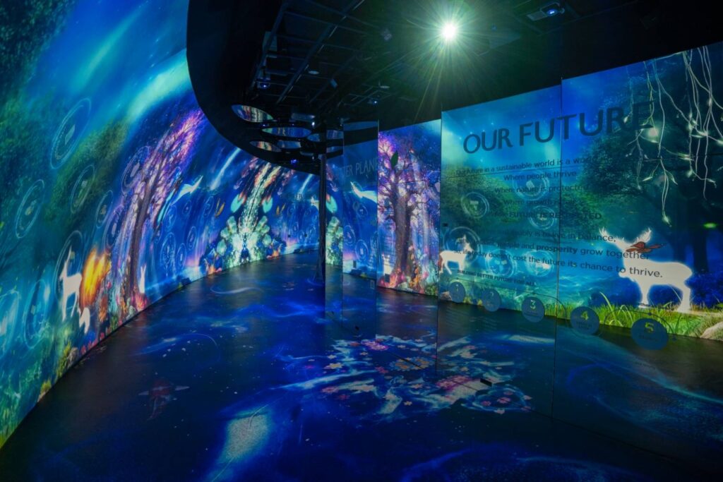 1.Better World, Better Futureโถงต้อนรับสุดตระการตา พาผู้ชมสู่ห้องเป็นลิฟท์ขนาดใหญ่ที่บรรจุคนเข้าไปในห้องมืด คล้ายกับกำลังยืนอยู่บนยานอวกาศก้าวไปสู่อีกหนึ่งหนึ่ง ต้อนรับด้วยคำพูดกระตุกความคิด นี่คือโอกาสทำเพื่ออนาคตโลก และคนรุ่นถัดไป ก่อนโลกจะล่มสลาย หากไม่เปลี่ยนก็จะไม่มีอนาคตให้เรา
