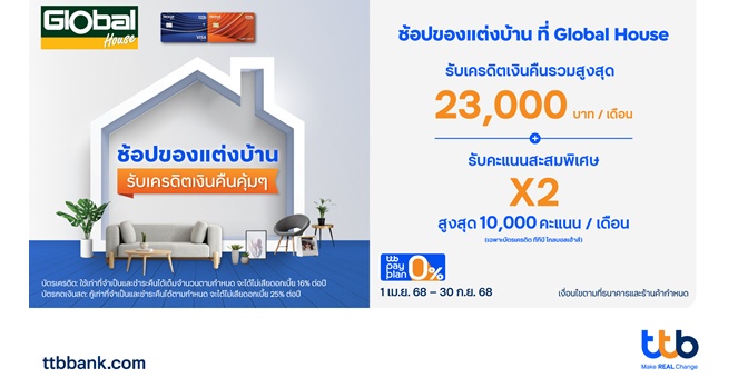 • บัตรทีทีบี โกลบอลเฮ้าส์ จัดแคมเปญพิเศษ เพื่อคนรักบ้าน รับเครดิตเงินคืนรวมสูงสุด 23,000 บาท ต่อเดือน พร้อมรับคะแนนสะสมพิเศษ 2 เท่า