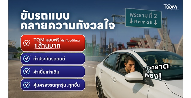 TQM เพิ่มความสบายใจให้ลูกค้า เติมความคุ้มครอง 1 ล้านบาท กรณีอุบัติเหตุบนถนนพระราม 2 สำหรับลูกค้าต่ออายุประกันรถยนต์และลูกค้าใหม่ทุกคนโดยไม่มีค่าใช้จ่ายเพิ่มแต่อย่างใด