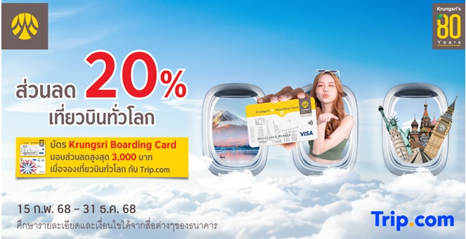 • รับส่วนลด 20% เมื่อจองเที่ยวบินทั่วโลก ผ่านบัตร Krungsri Boarding Card ที่ Trip.com