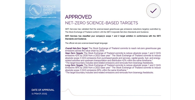 ตลาดหลักทรัพย์ฯ ได้รับการรับรองการตั้งเป้าหมาย Net Zero 2050 จาก SBTi พร้อมเดินหน้าตามแผนสู้วิกฤตโลกเดือด