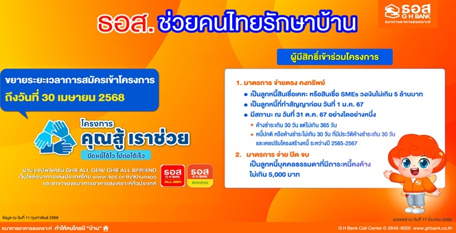 • ลูกค้า ธอส. ลงทะเบียนรับความช่วยเหลือผ่าน “โครงการคุณสู้ เราช่วย” ได้แล้ววันนี้ถึงวันที่ 30 เมษายน 2568