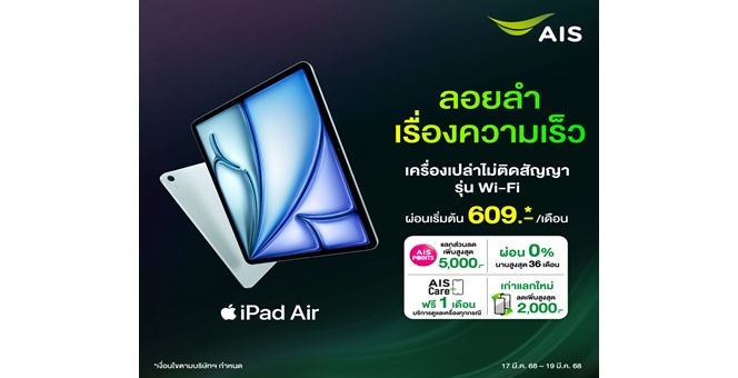 • AIS เตรียมวางจำหน่าย iPad Air รุ่นใหม่ ขนาด 11 นิ้ว และ 13 นิ้ว ที่มาพร้อมชิป M3