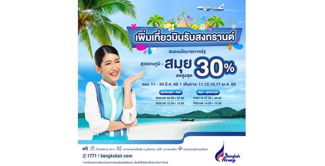star_borderModal Upgrade PackageModal Upgrade Packageสงกรานต์นี้บินสมุยสุดคุ้ม! บางกอกแอร์เวย์สขานรับนโยบายภาครัฐ เพิ่มเที่ยวบินพิเศษเส้นทางกรุงเทพ-สมุย พร้อมโปรลดสูงสุด 30%12 มี.ค. 2568 17:43 น.