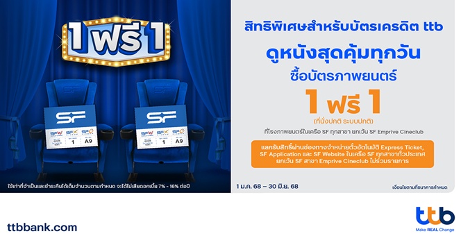 star_borderModal Upgrade PackageModal Upgrade Packageบัตรเครดิต ttb ชวนดูหนังสุดคุ้มที่ SF Cinema รับสิทธิ์ซื้อบัตรภาพยนตร์ 1 ที่นั่ง ฟรี 1 ที่นั่ง19 ก.พ. 2568 14:20 น.