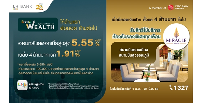 star_borderModal Upgrade PackageModal Upgrade PackageLH Bank มอบประสบการณ์สุดเอ็กซ์คลูซีฟ สำหรับลูกค้า B-You Wealth รับสิทธิ์พักก่อนบินเข้าใช้บริการห้องรับรอง Miracle Lounge ทุกเดือน ที่สนามบินดอนเมือง และสนามบินสุวรรณภูมิ19 ก.พ. 2568 12:28 น.