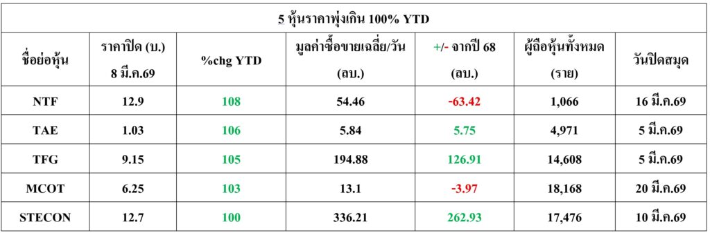 พบ 5 หุ้น NTF-TAE-TFG-MCOT-STECON ราคาซิ่งวิ่งเกินเท่าตัวสิ้นปีก่อน ส่วนใหญ่กำไรปี 68 โตเด่น ผู้ถือหุ้น 56,289 ราย ยิ้มร่า จับตาไปต่อได้หรือไม่ ? แต่ระวังเก็งกำไร เหตุขึ้นมามากแล้ว บางบริษัทผลงานยังขาดทุน-ไร้บทวิเคราะห์รองรับ