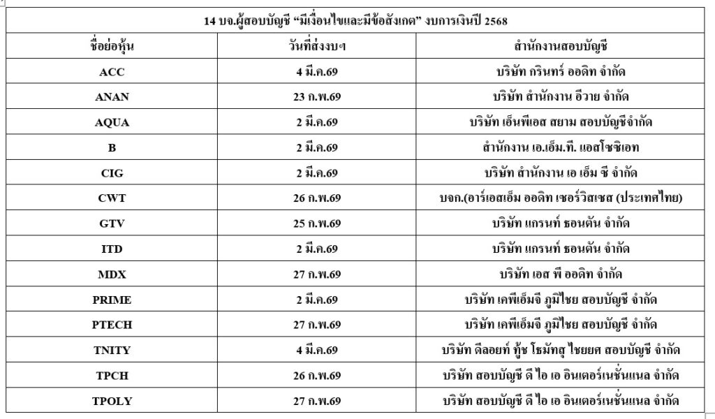 14 บจ. ผู้สอบบัญชี “มีเงื่อนไขและมีข้อสังเกต” ในงบการเงินปี 68 ประกอบด้วย