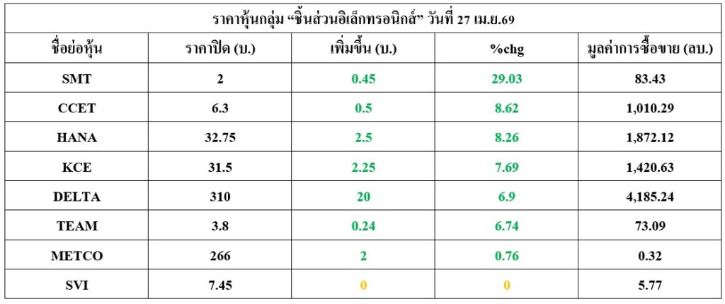 ดัชนี SET Index วันที่ 27 เม.ย.2569 ปิดที่ 1,479.13 จุด เพิ่มขึ้น 23.03 จุด หรือ 1.58% มูลค่าการซื้อขายรวม 4.72 หมื่นล้านบาท ไฮไลต์สำคัญคือการพุ่งแรงของหุ้นในกลุ่ม “ชิ้นส่วนอิเล็กทรอนิกส์” ที่ราคาปรับตัวเพิ่มขึ้นอย่างมีนัยสำคัญ 6 จาก 8 บริษัท ดังนี้