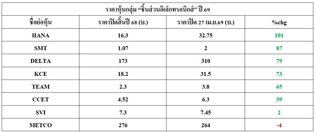 HANA ขึ้นแรงสุดถึง 101% จากสิ้นปี 68 ที่ 16.3 บาท ล่าสุดอยู่ที่ 32.75 บาท รองลงมาคือ SMT เพิ่มขึ้น 87% จาก 1.07 บาท เป็น 2 บาท และ DELTA เพิ่มขึ้น 79% จาก 173 บาท เป็น 310 บาท รวมถึง KCE เพิ่มขึ้น 73% จาก 18.2 บาท เป็น 31.5 บาท