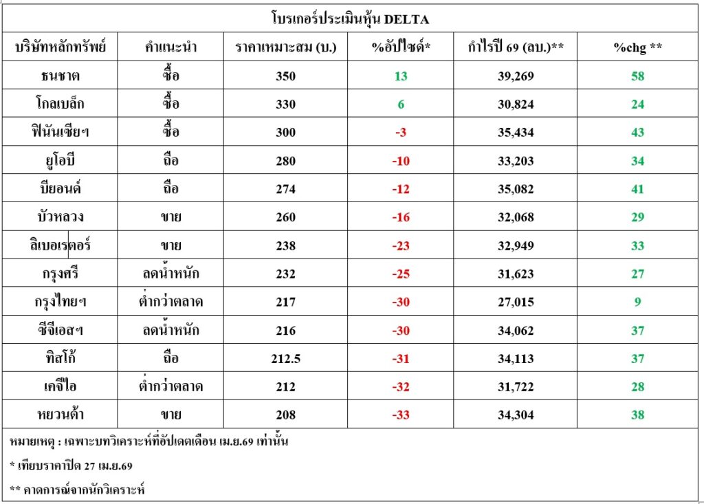 DELTA มีแนะนำ “ซื้อ” แค่ 3 โบรกเกอร์ ที่เหลือ แนะนำเพียง “ถือ” และ “ขาย” โดยส่วนใหญ่ราคาเหมาะสมต่ำกว่าราคาปัจจุบันอย่างมีนัยสำคัญ