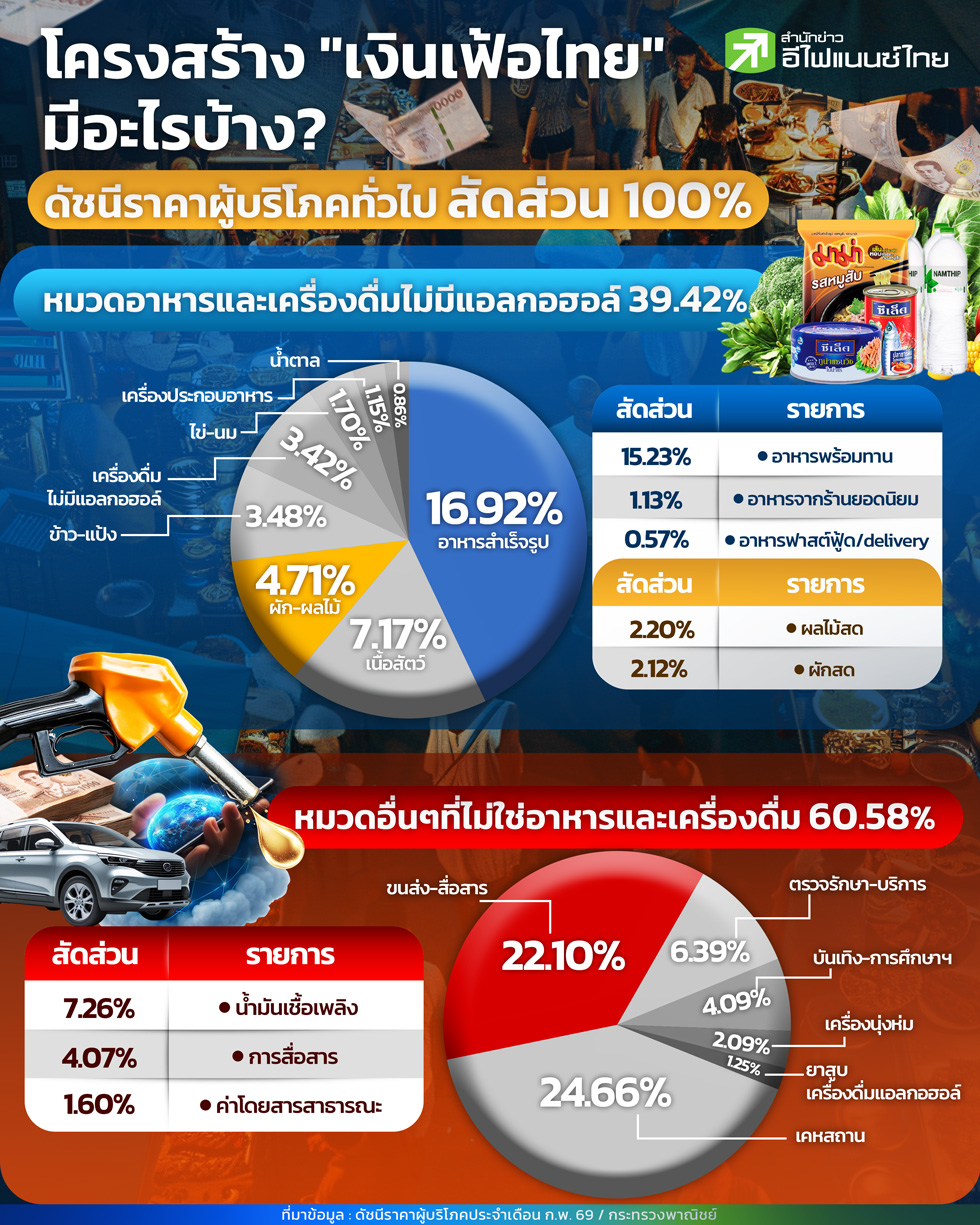 ตะกร้าเงินเฟ้อของไทยประกอบด้วยสินค้าและบริการประมาณ 430 รายการ โดยน้ำมันและพลังงานถูกจัดอยู่ในหมวด “พาหนะ การขนส่ง และการสื่อสาร” ซึ่งมีน้ำหนักสูงเป็นอันดับต้นๆ