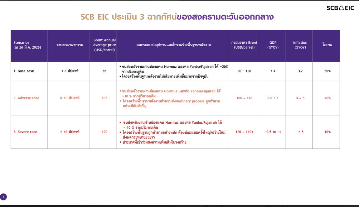 จากการวิเคราะห์สถานการณ์ปัจจุบัน ข้อมูลจาก SCB EIC ประเมิน 3 ฉากทัศน์ผลจากสงครามตะวันออกกลาง ทำให้ราคาน้ำมันแพง ส่งต่อไปยังเงินเฟ้อที่จะเพิ่มสูงขึ้น