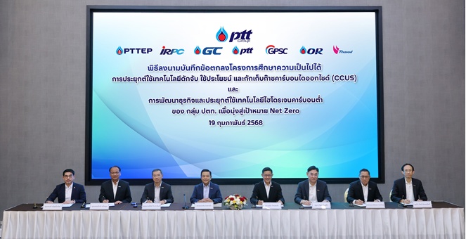 สำนักข่าวอีไฟแนนซ์ไทย- -20 ก.พ. 68 13:24 น. วานนี้ (19 กุมภาพันธ์ 2568) ผู้บริหารกลุ่ม ปตท. นำโดย ดร.คงกระพัน อินทรแจ้ง ประธานเจ้าหน้าที่บริหารและกรรมการผู้จัดการใหญ่ บริษัท ปตท. จำกัด (มหาชน) เป็นประธานพิธีลงนามบันทึกข้อตกลงโครงการศึกษาความเป็นไปได้การประยุกต์ใช้เทคโนโลยีดักจับ ใช้ประโยชน์ และกักเก็บก๊าซคาร์บอนไดออกไซด์ (Carbon Capture Utilization and Storage: CCUS) และบันทึกข้อตกลงการพัฒนาธุรกิจและประยุกต์ใช้เทคโนโลยีไฮโดรเจนคาร์บอนต่ำของกลุ่ม ปตท. เพื่อมุ่งสู่เป้าหมาย Net Zero ครอบคลุมการศึกษาโครงสร้างต้นทุนที่เหมาะสม