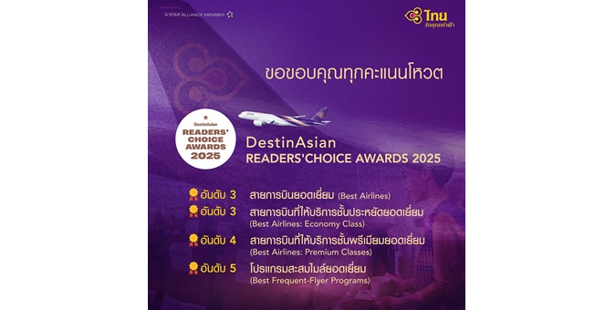 การบินไทยได้รับการจัดอันดับรางวัลสายการบินยอดเยี่ยมอันดับ 3 และอีก 3 รางวัล จาก DestinAsian Readers’ Choice Awards 2025
