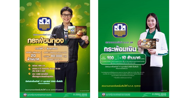 star_borderModal Upgrade Packageธ.ก.ส. เปิดตัว 2 สลากออมทรัพย์ ธ.ก.ส. ชุดใหม่ รับเทศกาลตรุษจีน “กระพ้อมทอง” และ “กระพ้อมเงิน” ลุ้นโชคใหญ่ได้ทุกเดือน17 ก.พ. 2569 10:35 น.