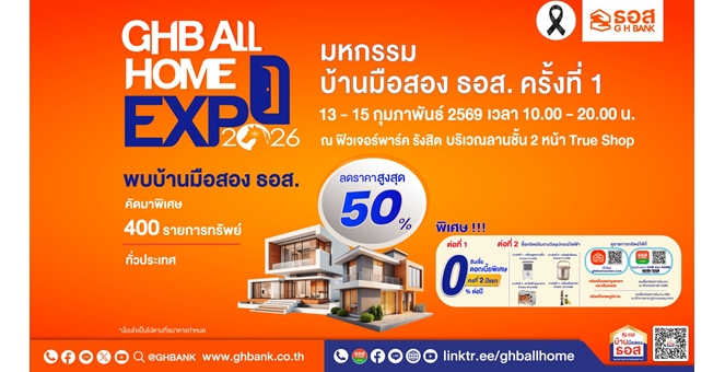 star_borderModal Upgrade Packageวาเลนไทน์นี้ให้บ้านเป็นของขวัญ! ธอส. จัดมหกรรม GHB ALL HOME EXPO 2026 ลดสูงสุด 50% ราคาเริ่มต้นเพียง 2.3 แสนบาท พร้อมโปรสินเชื่อดอกเบี้ย 0% ต่อปี10 Feb 2026 14:35