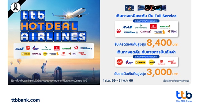 star_borderModal Upgrade Packageบัตรเครดิต ttb เปิดดีลบินสุดคุ้มรับต้นปี มอบเครดิตเงินคืนสูงสุด 8,400 บาท เมื่อซื้อตั๋วเครื่องบิน 15 สายการบินชั้นนำ6 Feb 2026 11:17