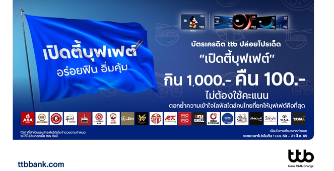 star_borderModal Upgrade Packageบัตรเครดิต ttb เปิดแคมเปญ “เปิดตี้บุฟเฟต์” กินครบ 1,000 บาท คืน 100 บาท ไม่ต้องแลกคะแนน ได้คืนง่าย ๆ ไม่ซับซ้อน28 Jan 2026 11:57