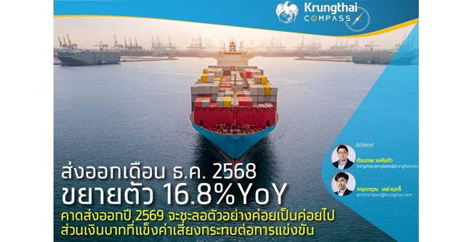 star_borderModal Upgrade PackageKrungthai COMPASS เผยส่งออกเดือน ธ.ค. 2568 ขยายตัว 16.8%YoY คาดส่งออกปี 2569 จะชะลอตัวอย่างค่อยเป็นค่อยไป ส่วนเงินบาทที่แข็งค่าเสี่ยงกระทบต่อการแข่งขัน26 Jan 2026 16:07