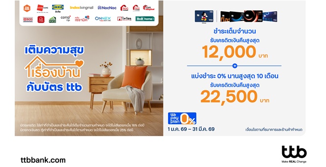 star_borderModal Upgrade Packageบัตรเครดิต ttb ชวนแต่งบ้านรับปีใหม่ ช้อปคุ้มร้านดัง รับเครดิตเงินคืนสูงสุด 22,500 บาท พร้อมผ่อน 0% นานสูงสุด 10 เดือน15 Jan 2026 14:46