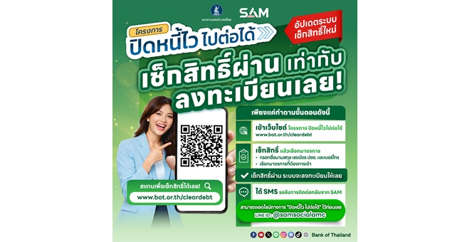 star_borderModal Upgrade PackageSAM เปิดช่องลูกหนี้ NPL เช็กสิทธิ์-ลงทะเบียน “ปิดหนี้ไว ไปต่อได้” ก่อนเที่ยวสงกรานต์ คลิกเดียวรู้ผลทันที ย้ำชัดระบบเช็กง่าย ปลอดภัย 100%10 Apr 2026 12:32