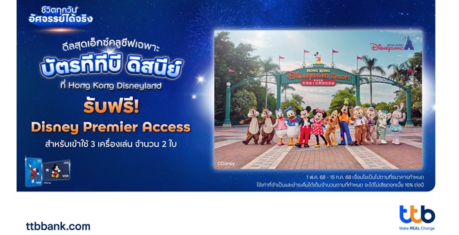 star_borderModal Upgrade Packageทีทีบี x ดิสนีย์ ชวนเปิดประสบการณ์สุดมหัศจรรย์สู่ “ฮ่องกงดิสนีย์แลนด์รีสอร์ท” พร้อมรับฟรี! บัตร Disney Premier Access เพียงซื้อแพ็กเกจ “Stay and Play for Two with Early Park Entry” และชำระด้วยบัตรเดบิตหรือบัตรเครดิต ทีทีบี ดิสนีย์9 May 2025 15:49