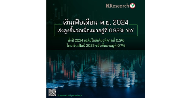star_borderModal Upgrade Packageศูนย์วิจัยกสิกรฯ เผยเงินเฟ้อเดือน พ.ย. 2024 เร่งสูงขึ้นต่อเนื่องมาอยู่ที่ 0.95% YoY ทั้งปี 2024 เฉลี่ยใกล้เคียงที่คาดที่ 0.5% โดยเงินเฟ้อปี 2025 ขยับขึ้นมาอยู่ที่ 0.7%4 Dec 2024 17:36