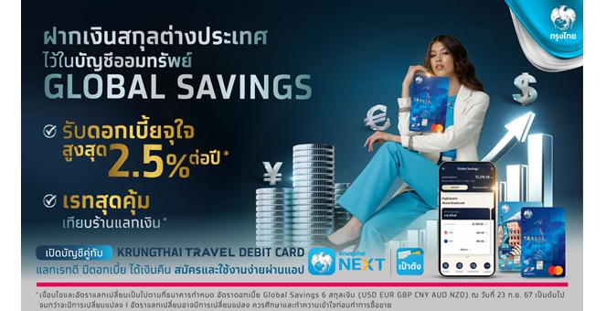star_borderModal Upgrade Packageกรุงไทยจัดเต็ม บัญชีออมทรัพย์สกุลเงินต่างประเทศ Global Savings เรทดี ดอกเบี้ยสูงสุด 2.5% ต่อปี ตอบโจทย์ทุกความต้องการด้านต่างประเทศ ฝาก-โอน-ลงทุน-ใช้จ่าย ครบจบในที่เดียว25 Nov 2024 13:47