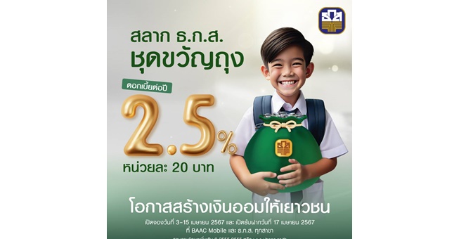 star_borderModal Upgrade Packageธ.ก.ส. ชวนเด็กๆ ออมเงิน เปิดสลากขวัญถุง หน่วยละ 20 บาท รับดอกเบี้ย 2.5% แถมลุ้นรางวัลรวมมูลค่ากว่า 73 ล้านบาท เปิดจอง 3 เม.ย. นี้3 Apr 2024 08:32