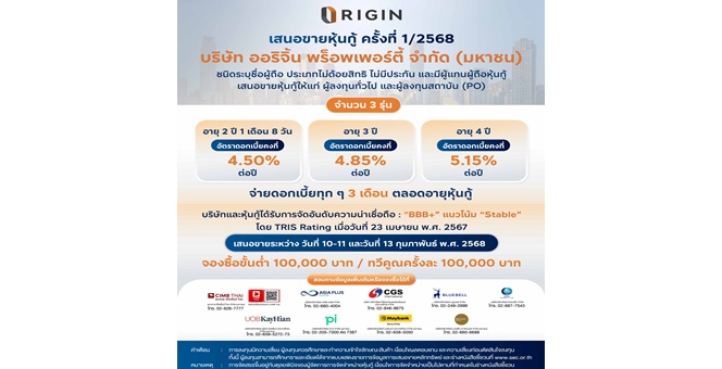 star_borderModal Upgrade PackageORI โชว์ Backlog แกร่ง 47,329 ล้านบาท รอรับรู้รายได้ต่อเนื่อง 5 ปี พร้อมเสนอขายหุ้นกู้ชุดใหม่ 10 – 11, 13 กุมภาพันธ์ 2568 นี้ ให้แก่ผู้ลงทุนทั่วไป ชูอัตราดอกเบี้ยคงที่ 4.50 -5.15% ต่อปี20 Jan 2025 17:14