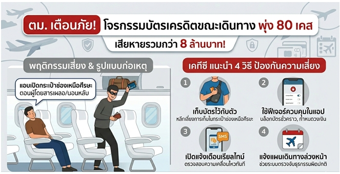 star_borderModal Upgrade Packageตม. เตือนภัยโจรกรรมบัตรเครดิตช่วงเดินทาง พุ่ง 80 เคส เสียหายกว่า 8 ล้านบาท เคทีซีแนะเก็บบัตรไว้กับตัว พร้อมใช้ฟีเจอร์ควบคุมผ่านแอปลดความเสี่ยง30 Mar 2026 13:00