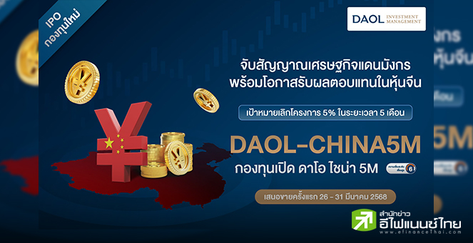 • บลจ.ดาโอ เปิดขาย “กองทุนเปิด ดาโอ ไชน่า 5M” เป้าหมายเลิกโครงการ 5% ในระยะเวลา 5 เดือน