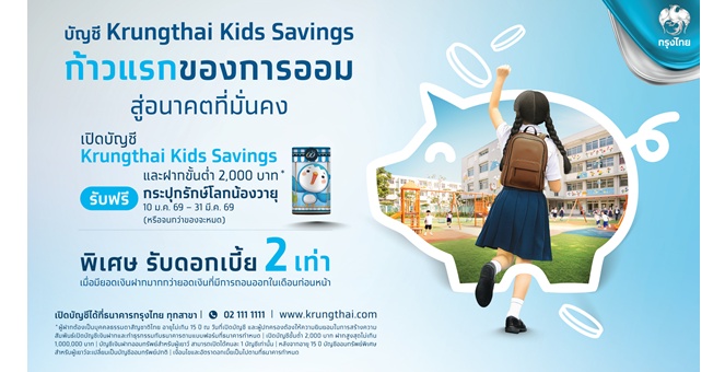 star_borderModal Upgrade Packageกรุงไทยมอบของขวัญวันเด็ก เริ่มต้นก้าวแรกการออม ด้วยบัญชี Krungthai Kids Savings รับดอกเบี้ย และโบนัสรวมเป็น 2 เท่า พร้อมกระปุกน้องวายุ8 Jan 2026 13:07
