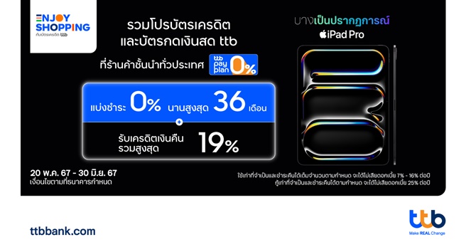 star_borderModal Upgrade Packageบัตรเครดิต และบัตรกดเงินสด ttb มอบสิทธิ์สุดคุ้มเมื่อซื้อ iPad Pro และ iPad Air แบ่งชำระ 0% นานสูงสุด 36 เดือน และรับเครดิตเงินคืนรวมสูงสุด 19%4 Jun 2024 11:42
