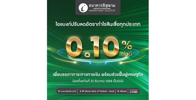 star_borderModal Upgrade Packageไอแบงก์ขานรับมติ กนง. ปรับลดอัตรากำไรสินเชื่อทุกประเภท 0.10% บรรเทาภาระทางการเงินลูกค้าสินเชื่อ มีผล 22 ธ.ค. 68 พร้อมชูเงินฝาก e-Savings ผลตอบแทนสูง 2.2% ส่งเสริมการออม19 Dec 2025 16:47