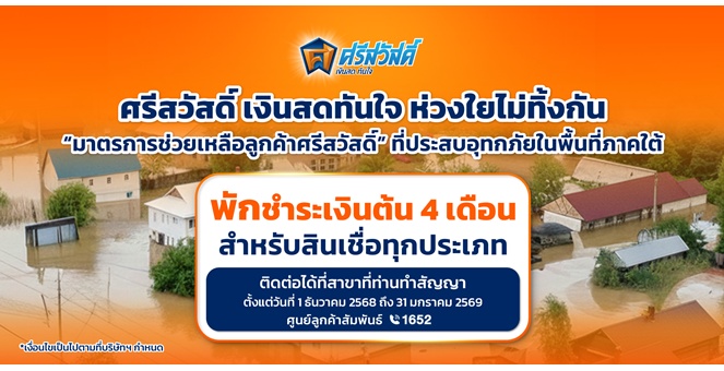 star_borderModal Upgrade PackageSAWAD ห่วงใยลูกค้าประสบอุทกภัยภาคใต้ ออกมาตรการช่วยเหลือ “พักชำระเงินต้น 4 เดือน” สำหรับสินเชื่อทุกประเภท11 Dec 2025 15:10