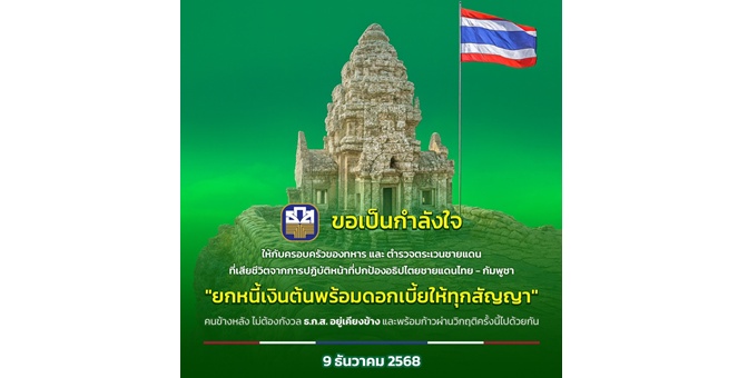 star_borderModal Upgrade Packageธ.ก.ส. เร่งช่วยเหลือทหาร และ ตชด. ที่เสียชีวิตจากการปกป้องอธิปไตยชายแดนไทย – กัมพูชา ยกหนี้เงินต้นพร้อมดอกเบี้ยทุกสัญญาเงินกู้9 Dec 2025 11:13