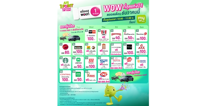 star_borderModal Upgrade PackageAIS มอบสุขสุดว้าว! ส่งท้ายปี ตลอดเดือนธันวาคม ใช้ เอไอเอส พอยท์ 1 คะแนน แลกรับฟรี! คูปองกว่า 20 แบรนด์ดัง พร้อมลุ้นโชค และสิทธิพิเศษมากมาย ที่แอป myAIS3 Dec 2025 14:19