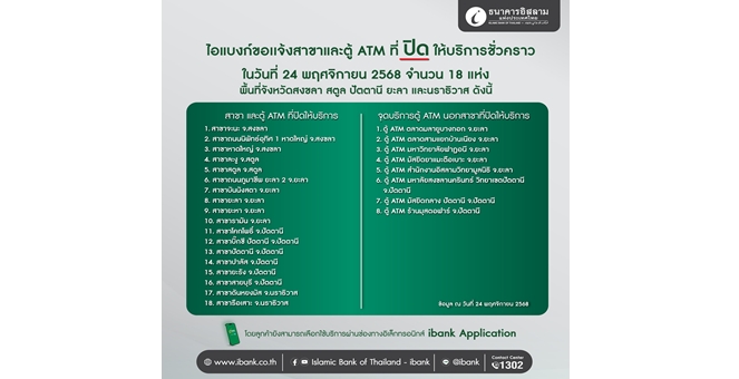 star_borderModal Upgrade Packageไอแบงก์ห่วงใยพี่น้องชาวใต้ เร่งระดมความช่วยเหลือเบื้องต้นและออกมาตรการรองรับ แจ้งปิดสาขาและตู้ ATM ในพื้นที่เสี่ยงชั่วคราว วันที่ 24 พฤศจิกายน แนะทำธุรกรรมผ่านแอปพลิเคชันทดแทน24 Nov 2025 17:16