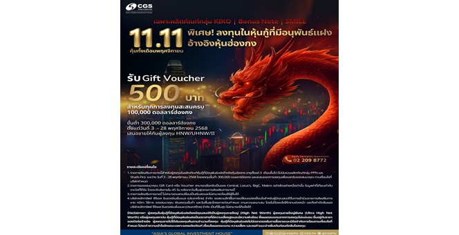 star_borderModal Upgrade PackageCGSI Structured Notes อ้างอิงหุ้นฮ่องกงมาแรง ไตรมาส 3/68 ยอดการลงทุนโตกว่า 80% รุกเปิดแคมเปญพิเศษรับการลงทุนเดือนพฤศจิกายนี้4 Nov 2025 10:23