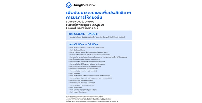 star_borderModal Upgrade Packageธนาคารกรุงเทพ แจ้งปิดปรับปรุงระบบชั่วคราว เพื่อพัฒนาและเพิ่มประสิทธิภาพการให้บริการลูกค้า31 Oct 2025 10:37