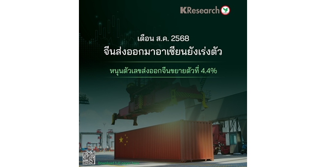 star_borderModal Upgrade Packageศูนย์วิจัยกสิกรฯ เผยเดือน ส.ค.68 จีนส่งออกมาอาเซียนยังเร่งตัว หนุนตัวเลขส่งออกจีนขยายตัวที่ 4.4%8 Sept 2025 17:09