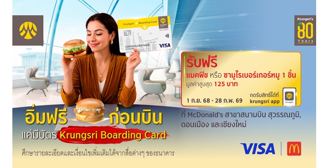 star_borderModal Upgrade Packageอิ่มฟรีก่อนบิน แค่มี Krungsri Boarding Card รับฟรี แมคฟิช หรือ ซามูไรเบอร์เกอร์หมู ที่ McDonald`s สาขาสนามบิน5 Sept 2025 11:01