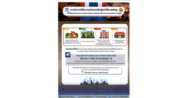 star_borderModal Upgrade Package“ธนารักษ์” ออกมาตรการช่วยเหลือผู้เช่าที่ราชพัสดุที่ได้รับผลกระทบ จากเหตุการณ์ความไม่สงบบริเวณชายแดนไทย-กัมพูชา7 Aug 2025 10:17