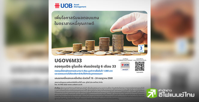 • บลจ.ยูโอบี เสนอโอกาสลงทุนในพันธบัตรภาครัฐ กองทุนเปิด ยูไนเต็ด พันธบัตรรัฐ 6 เดือน 33 (UGOV6M33) IPO 18-24 ก.ค.68