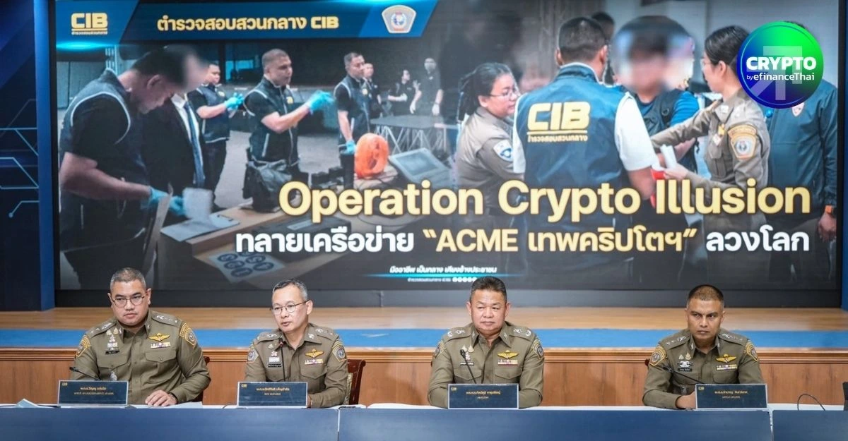 ตำรวจสอบสวนกลาง (CIB) เปิดปฏิบัติการ Operation Crypto Illusion ทลายเครือข่าย ACME “เทพคริปโต” ลวงโลก บุกทลายเครือข่ายหลอกลงทุน “1000x.live” และ “Wowbit” ของนายวรวัฒน์ หรือ “แอ็คมี่” จับกุมผู้ต้องหา 3 ราย พร้อมยึดทรัพย์สินหรูหลายรายการ รวมมูลค่าความเสียหายกว่า 1,300 ล้านบาท หลังพบพฤติการณ์หลอกชักชวนลงทุนเทรดทองคำและโปรเจกต์เหรียญคริปโตอ้างกำไรสูงถึง 200% แต่ไม่สามารถถอนเงินได้จริง และมีการฟอกเงินผ่านระบบ DeFi เพื่ออำพรางเส้นทางการเงิน