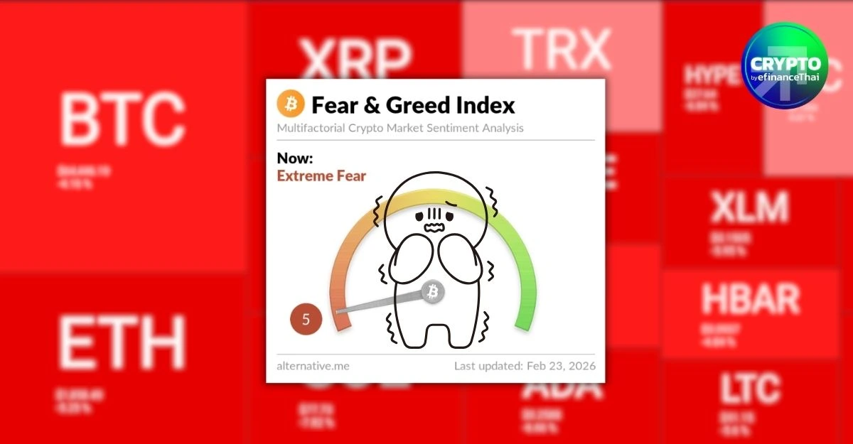 ดัชนี Fear & Greed ของตลาดคริปโทฯ วันนี้อยู่ที่ 5 คะแนน จัดอยู่ในระดับ Extreme Fear หรือ “ความกลัวขั้นรุนแรงมาก” ต่ำสุดเป็นประวัติการณ์อีกครั้ง หลังเพิ่งเห็นระดับนี้ไปเมื่อ 12 ก.พ.ที่ผ่านมา สะท้อนอารมณ์ตลาดที่เปราะบางและแรงเทขายเชิงป้องกันความเสี่ยงที่ยังไม่จบง่าย