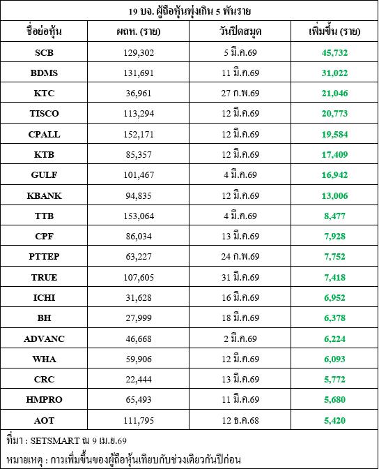 ด้าน บมจ.ซีพี ออลล์ (CPALL) ข้อมูลล่าสุด ณ 12 มี.ค.2569 มีจำนวนผู้ถือหุันทั้งหมด 152,171 ราย เทียบกับ 12 มี.ค.2568 มีจำนวนผู้ถือหุ้นทั้งหมด 132,587 คิดเป็นการเพิ่มขึ้นของผู้ถือหุ้นถึง 19,584 ราย, ธนาคารกรุงไทย (KTB) ข้อมูลล่าสุด ณ 12 มี.ค.2569 มีจำนวนผู้ถือหุันทั้งหมด 85,357 ราย เทียบกับ 13 มี.ค.2568 มีจำนวนผู้ถือหุ้นทั้งหมด 67,948 คิดเป็นการเพิ่มขึ้นของผู้ถือหุ้นถึง 17,409 ราย